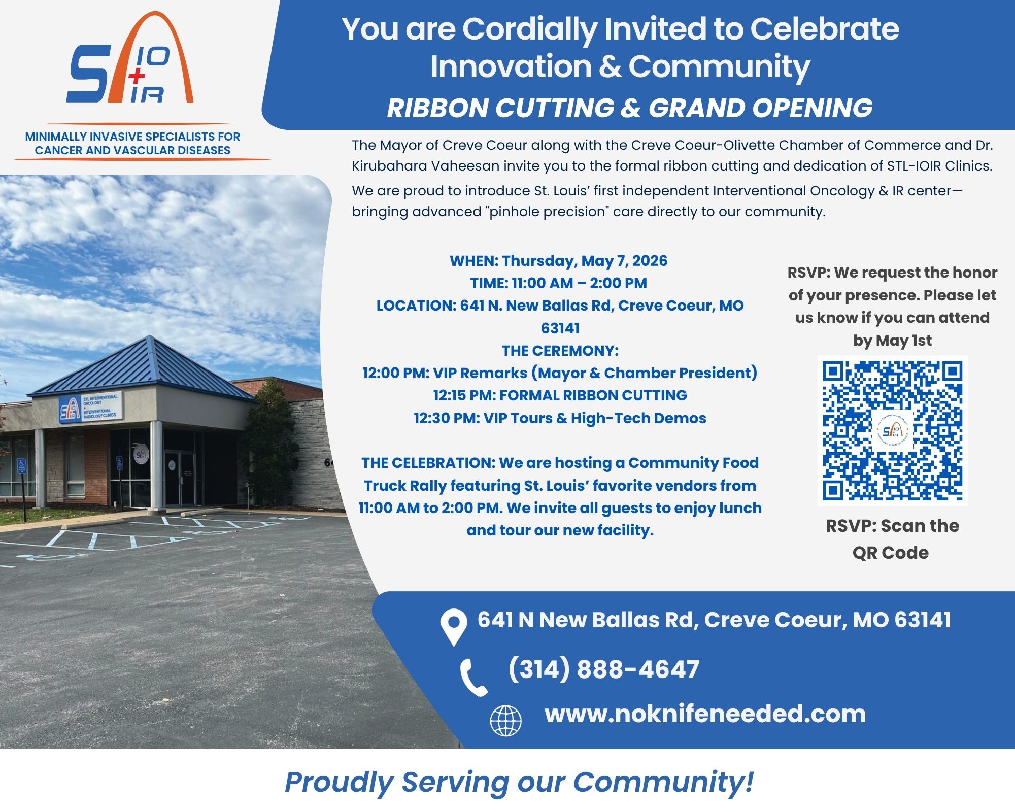 | 5/7/2026 | The Mayor of Creve Coeur along with the Creve Coeur-Olivette Chamber of Commerce and Dr. Kirubahara Vaheesan invite you to the formal ribbon cutting and dedication of STL-IOIR Clinics. We are proud to introduce St. Louis’ first independent Interventional Oncology & IR center—bringing advanced "pinhole precision" care directly to our community. RSVP: We request the honor of your presence. Please let us know if you can attend.CLICK HERE to RSVP by May 1st more info... |
